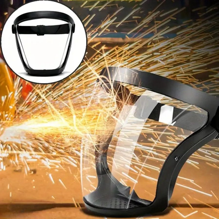 ¡Los accidentes laborales son comunes! ¡Protégete siempre! Evita que objetos filosos, aserrín o polvo fino vuelen hacia tu cara y tus ojos. ¡USA ESTE ESCUDO! Protege tu rostro, tus ojos y tus vías respiratorias. Tiene suficiente espacio para usar junto con una mascarilla y unos lentes.