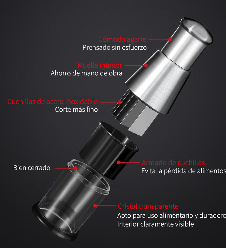 - Material: Tazón de PP transparente, cuchillas y prensador de acero inoxidable, bloqueador de cuchillas de ABS